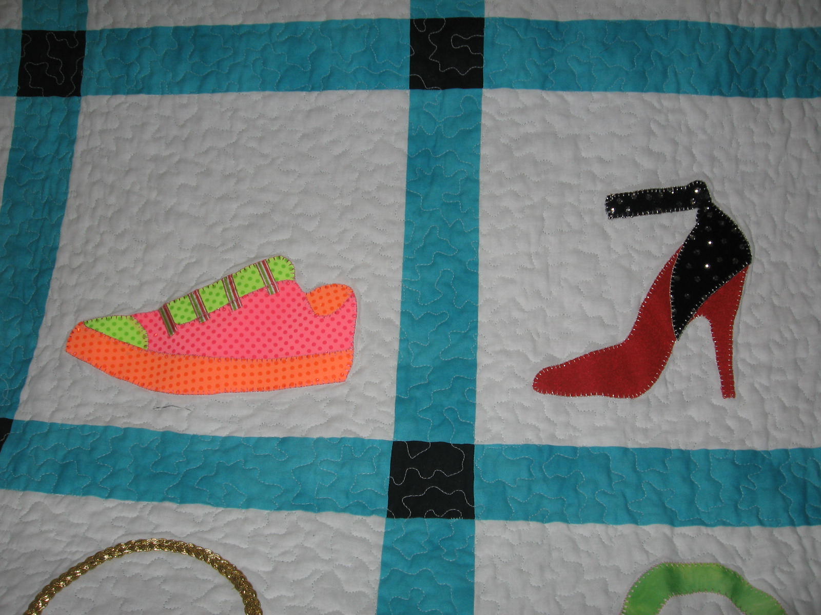 Last year, I was asked to create a special quilt for my niece for her 13th birthday. Her mom wanted me to use her dance costumes which had accumulated over several years worth of dance recitals. Because Madison loves purses and shoes, the obvious design would include blocks showing a variety of "accessories." Thus, the purse and shoe quilt was born.